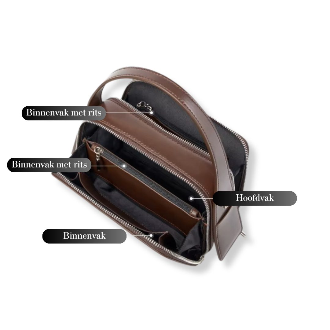 - Vakken: 2 hoofdvakken, 2 binnenvakken met rits, 1 steekvak, 1 pashouder op hengsel